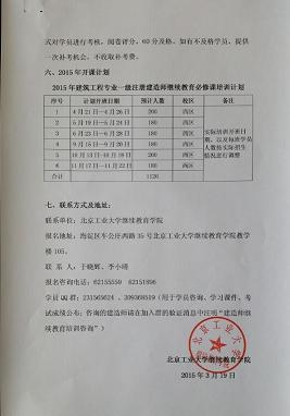 北京工业大学2015年关于举办建筑工程专业一级注册建造师继续教育必修课培训的通知及排课计划 各相关单位、各位一级注册建造师、一级临时建造师: 根据住房和城乡建设部《注册建造师继续教育管理暂行办法》的要求,为进一步推动我校建筑工程专业一级注册建造师继续教育培训工作的全面开展,2015年必修课即将开始,现将有关事项及培训排课计划安排如下: 一、参加人员 已注册或取得一级注册建造师执业资格的一级建造师,60岁以下的一级临时建造师。 ?2012年12月31日之前取得执业资格的一级建造师,注册期已满,请务必参加继续教育培训; ?2011年之前取得执业资格或注册的一级建造师,2013年未参加继续教育可以在本年度继续参加继续教育培训; ?已参加完2013年度第一轮继续教育的一级建造师,将进入第二个培训周期(以注册日期计算每三年一个注册周期); ?取得一级注册建造师执业资格证书,尚未注册,但证书已期满三年。 二、培训内容与课时 建筑工程专业一级注册建造师必修课包括:《建筑工程新法律法规》《建筑工程专业技术(上、下)》《工程项目管理前沿理论与实务》《国内外工程建设法律制度》共计60学时。 三、培训形式 必修课的培训采取全脱产面授形式,学员参加培训并经考核合格后,由中国建筑业协会建筑工程专业一级注册建造师继续教育管理办公室确认学时;(上课有考勤记录) 四、有关费用 必须课有关费用,1800元/人,增项减半。含培训费、教材资料费、培训证书费。食宿自理。收费形式可采用现金、支票、借记卡刷卡、银行汇款等形式。 汇款单位:北京工业大学 开户银行:交行车公庄西路支行 账号:110060666018010031591 五、考核形式: 我校学员完成60学时的必修课程学习后,将采取开卷笔试的形式对学员进行考核,阅卷评分,60分及格。如有不及格学员,提供一次补考机会,不收取补考费。 六、2015年开课计划 2015年建筑工程专业一级注册建造师继续教育必修课培训计划 序号 | 计划开班日期 | 预计人数 | 校区 | 备注 | 1 | 4月21日—4月26日 | 200 | 西区 | 实际培训开班日期,以及每班学员人数按实际招生情况进行调整 | 2 | 5月19日—5月24日 | 180 | 西区 | 3 | 6月23日—6月28日 | 180 | 西区 | 4 | 9月15日—9月20日 | 180 | 西区 | 5 | 10月13日-10月18日 | 200 | 西区 | 6 | 11月17日—11月22日 | 180 | 西区 | 合计 | ? | 1120 | ? |