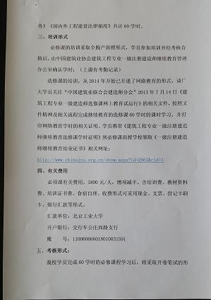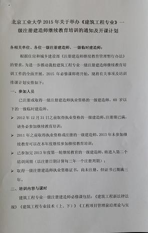 北京工业大学2015年关于举办建筑工程专业一级注册建造师继续教育必修课培训的通知及排课计划 各相关单位、各位一级注册建造师、一级临时建造师: 根据住房和城乡建设部《注册建造师继续教育管理暂行办法》的要求,为进一步推动我校建筑工程专业一级注册建造师继续教育培训工作的全面开展,2015年必修课即将开始,现将有关事项及培训排课计划安排如下: 一、参加人员 已注册或取得一级注册建造师执业资格的一级建造师,60岁以下的一级临时建造师。 ?2012年12月31日之前取得执业资格的一级建造师,注册期已满,请务必参加继续教育培训; ?2011年之前取得执业资格或注册的一级建造师,2013年未参加继续教育可以在本年度继续参加继续教育培训; ?已参加完2013年度第一轮继续教育的一级建造师,将进入第二个培训周期(以注册日期计算每三年一个注册周期); ?取得一级注册建造师执业资格证书,尚未注册,但证书已期满三年。 二、培训内容与课时 建筑工程专业一级注册建造师必修课包括:《建筑工程新法律法规》《建筑工程专业技术(上、下)》《工程项目管理前沿理论与实务》《国内外工程建设法律制度》共计60学时。 三、培训形式 必修课的培训采取全脱产面授形式,学员参加培训并经考核合格后,由中国建筑业协会建筑工程专业一级注册建造师继续教育管理办公室确认学时;(上课有考勤记录) 四、有关费用 必须课有关费用,1800元/人,增项减半。含培训费、教材资料费、培训证书费。食宿自理。收费形式可采用现金、支票、借记卡刷卡、银行汇款等形式。 汇款单位:北京工业大学 开户银行:交行车公庄西路支行 账号:110060666018010031591 五、考核形式: 我校学员完成60学时的必修课程学习后,将采取开卷笔试的形式对学员进行考核,阅卷评分,60分及格。如有不及格学员,提供一次补考机会,不收取补考费。 六、2015年开课计划 2015年建筑工程专业一级注册建造师继续教育必修课培训计划 序号 | 计划开班日期 | 预计人数 | 校区 | 备注 | 1 | 4月21日—4月26日 | 200 | 西区 | 实际培训开班日期,以及每班学员人数按实际招生情况进行调整 | 2 | 5月19日—5月24日 | 180 | 西区 | 3 | 6月23日—6月28日 | 180 | 西区 | 4 | 9月15日—9月20日 | 180 | 西区 | 5 | 10月13日-10月18日 | 200 | 西区 | 6 | 11月17日—11月22日 | 180 | 西区 | 合计 | ? | 1120 | ? |