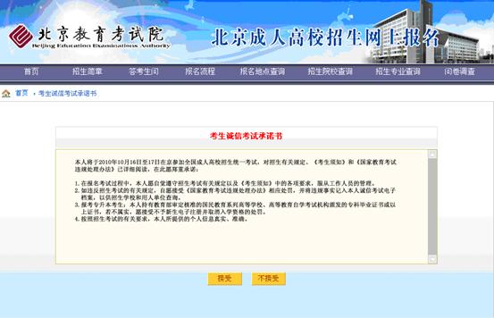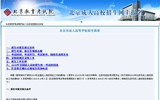 2010年北京市成人高校招生报名将于2010年8月15日零点开始,考生先在网上输入考生基本信息及志愿信息、进行网上交费,然后再到报名确认点办理报名资格审查、摄像及打印复核单等手续。其中报名时间为8月15日零点至28日24时,报名确认时间为9月3日至7日。未在报名确认点进行报名确认则报名无效。