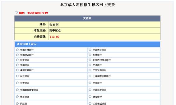1.点击[网上交费]后,进入到网上交费主页面,在此页面中,考生点击相应的银行,先了解如何进行网上交费。如下图: